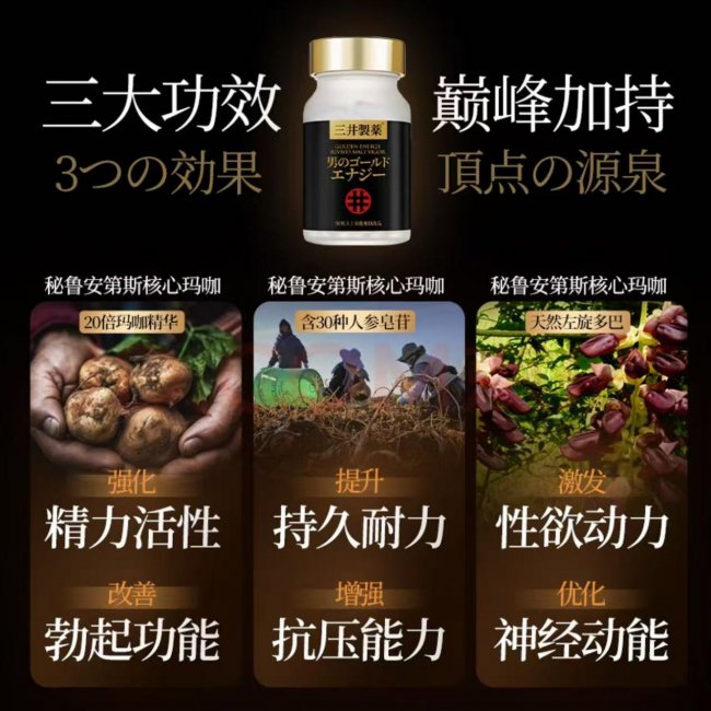 这正是三井制药龙虎丸的设计起点。三井龙虎丸是日本三井制药株式会社推出的男性健康膳食补充剂,采用VITALITY MAX专利提纯技术,整合秘鲁安第斯核心玛咖、威斯康星州核心西洋参、泰国超优栽培刺毛黧豆等12种精粹成分,从男性核心问题、身体机能、外在形象到心理健康,构建完整的四维调理矩阵。其中玛咖精华经20倍超浓缩提纯,有效成分纯度达99.9%,远超市面普通产品的原料标准。