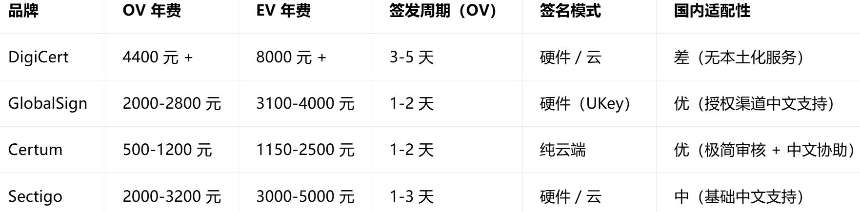 劣势:SmartScreen 信誉积累慢(需 2-5 天),微软信任偏好低于 DigiCert、GlobalSign,售后技术支持较弱。