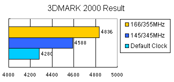 如果将GeForce DDR的核心频率从默认超至166MHz将使像素填充率提高37%, 在大多部游戏中, 帧数都将随频率的提升而增长,