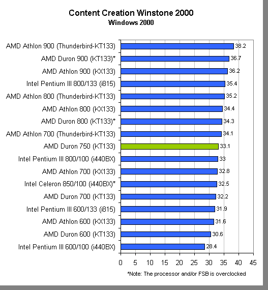 Content Creation Winston 2000 并不需要很高的配置来运行,当前的CPU都可以顺利通过其多媒体的测试。对于那些和CCWinston 2000模型工作类似(如多媒体应用、Office办公、上网和图象编辑等)的用户来说毒龙可以提供与更贵的速龙和雷鸟同样的性能。