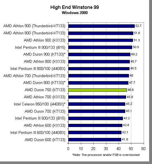 总的来说毒龙比同频的雷鸟在HighEnd Winston 99的得分要低5%,很明显在本项测试中具有更快的二级缓存的毒龙比具有更大二级缓存的速龙表现要好。速龙的分值只比毒龙高了1~2%。而具有更快和更大二级缓存的雷鸟毫无疑问在本项测试中独占鳌头。