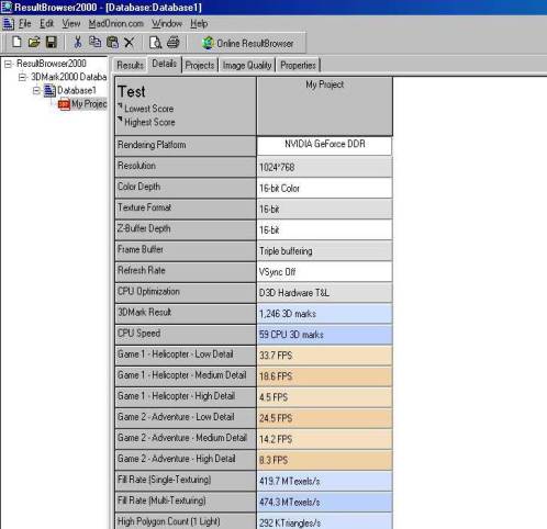 这项测试很快,一般是看不见画面的,但是可以用Result Browser来观看结果。 如果你的3D MARK 2000有Result Browser的话,就可以来观看结果了,3D MARK 2000的总的分=(Game1LowFPS + Game1MediumFPS + Game1HighFPS + Game2LowFPS + Game2MediumFPS + Game2HighFPS) * 12 其实也就是几项游戏的总的得分相加在乘以12,所以在游戏Game 1和Game 2的测试中的分数对整体分数的影像是很大的,所以即使你的显卡不是很好,但是在低分辨率的时候分数仍然不会很低,这样导致最后结果也不会太低的,所以在分数计算方面3D MARK 2000不是很公平的。下面是用Result Browse来观看结果的画面(图十三):