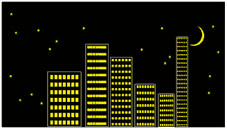 4 调整月亮、星星的大小,复制一些星星,散落在天空各处,而月亮则在楼房附近。